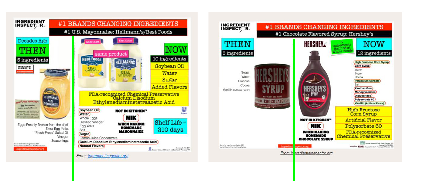 Images ci-jointes extraites de ce billet du dr Eades: mayonnaise et sirop. Il s'est basé sur la page https://www.ingredientinspector.org/home/top-brands-changing-ingredients. J'ai rajouté une barre vert fluo, car l'image est spécialement confuse pour ceux qui ne lisent pas l'anglais. Je ne connais pas encore de robot qui traduise automatiquement les images...