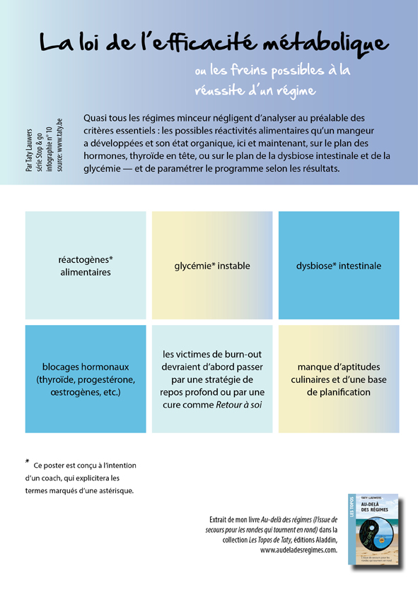 <a href="https://www.taty.be/regime/AUR_infographie10.html"><img src="https://www.taty.be/regime/tatybe_AUR10_freinspossMED.jpg" title ="Au-delà des régimes et le Stop&Go - infographie nr 10, par Taty Lauwers" alt="Au-delà des régimes et le Stop&Go, par Taty Lauwers - infographie nr 10" border="0" style="max-width:100%; min-width:300px; margin: 0 auto 20px auto; display:block;"> <p style="max-width:800px; min-width:300px; margin:0 auto; text-align:center;"> Au-delà des régimes et le Stop&Go, infographie nr 10</a> (sur le site www.taty.be)</p>