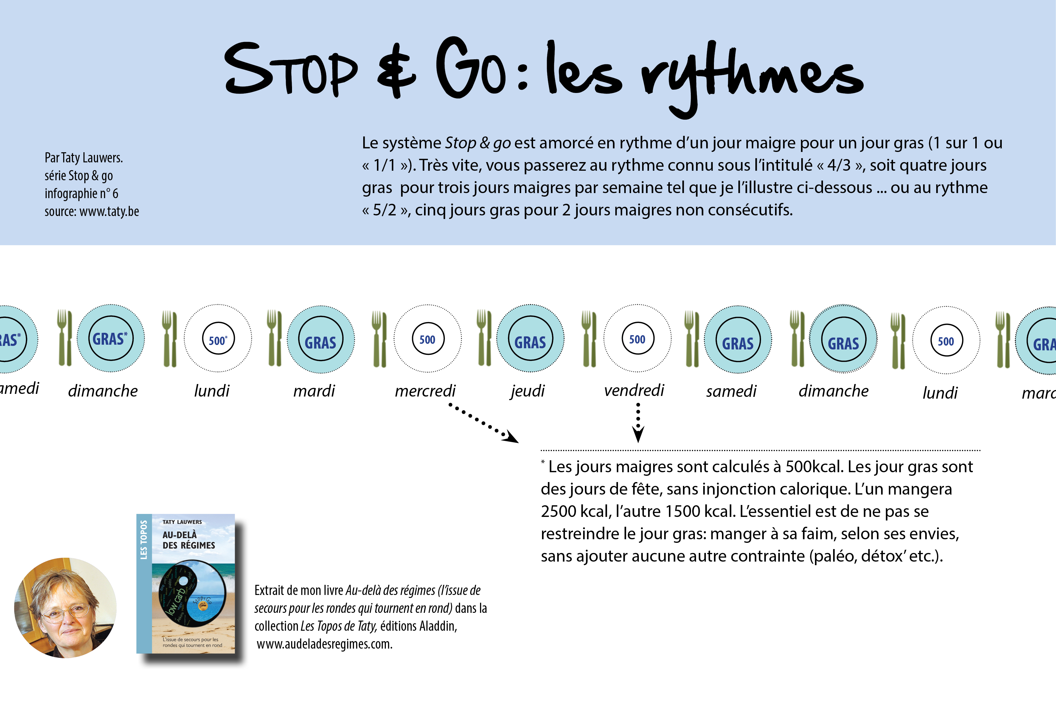 <a href="https://www.taty.be/regime/AUR_infographie6.html"><img src="https://www.taty.be/regime/tatybe_AUR6_rythme_S&G_4&3MED.jpg" title ="Au-delà des régimes et le Stop&Go - infographie nr 6, par Taty Lauwers" alt="Au-delà des régimes et le Stop&Go, par Taty Lauwers - infographie nr 6" border="0" style="max-width:100%; min-width:300px; margin: 0 auto 20px auto; display:block;"> <p style="max-width:800px; min-width:300px; margin:0 auto; text-align:center;"> Au-delà des régimes et le Stop&Go, infographie nr 6</a> (sur le site www.taty.be)</p>