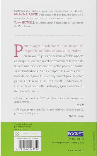 Présentation de l'éditeur. "Diététicienne primée pour ses recherches, le docteur Michelle HARVIE s'est consacrée pendant dix-sept ans à démontrer le lien entre surpoids et cancer du sein. Tony HOWELL est professeur d'oncologie à l'université de Manchester. Pour maigrir durablement, plus besoin de traquer la moindre calorie au quotidien : en suivant 2 jours de régime à faible apport calorique et en mangeant normalement le reste de la semaine, vous atteindrez votre poids de forme sans frustrations. Sans compter les autres bienfaits de ce régime 5 : 2, cliniquement prouvé, créé par le Dr Harvie et le Pr Howell : réduction du risque de cancer, effet anti-âge, gain d'énergie et de bonne humeur !"