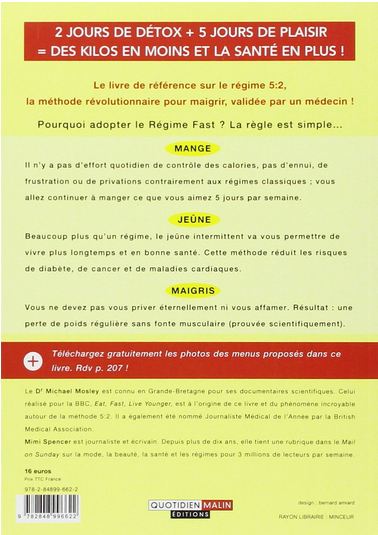 traduit de "The Fast Diet: The secret of intermittent fasting - lose weight, stay healthy, live longer", de Michael Mosley (médecin de formation, réalisateur à la BBC) + Fast Diet Recipe book (avec des extraits sur la page amazon)