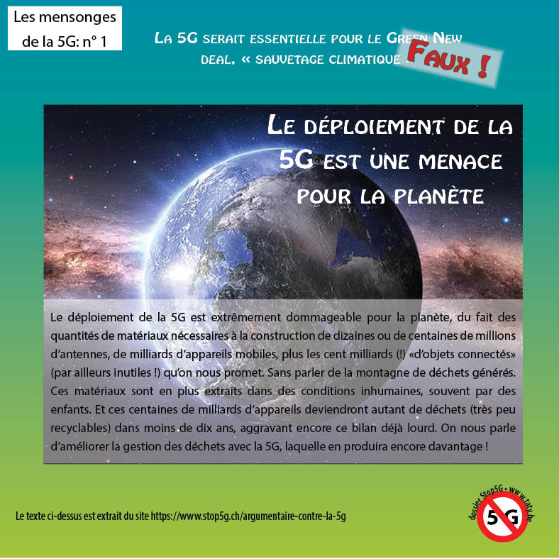 Le déploiement de la 5G est extrêmement dommageable pour la planète, du fait des quantités de matériaux nécessaires à la construction de dizaines ou de centaines de millions d’antennes, de milliards d’appareils mobiles, plus les cent milliards (!) «d’objets connectés» (par ailleurs inutiles !) qu’on nous promet. Sans parler de la montagne de déchets générés. Ces matériaux sont en plus extraits dans des conditions inhumaines, souvent par des enfants. Et ces centaines de milliards d’appareils deviendront autant de déchets (très peu recyclables) dans moins de dix ans, aggravant encore ce bilan déjà lourd. On nous parle d’améliorer la gestion des déchets avec la 5G, laquelle en produira encore davantage !